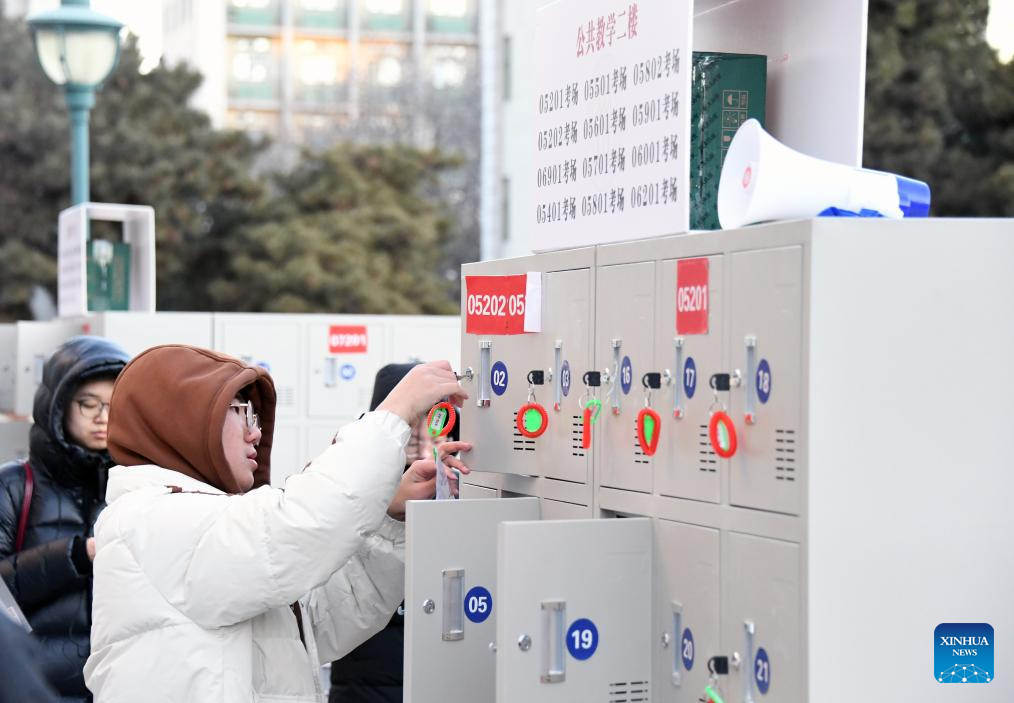 Test-takers store their belongings in lockers before entering an examination site for the 2025 postgraduate entrance exam in Beijing, capital of China, Dec. 21, 2024.