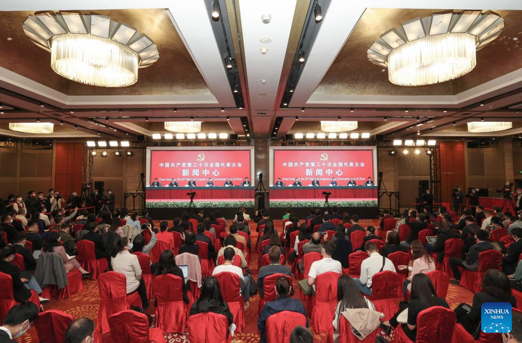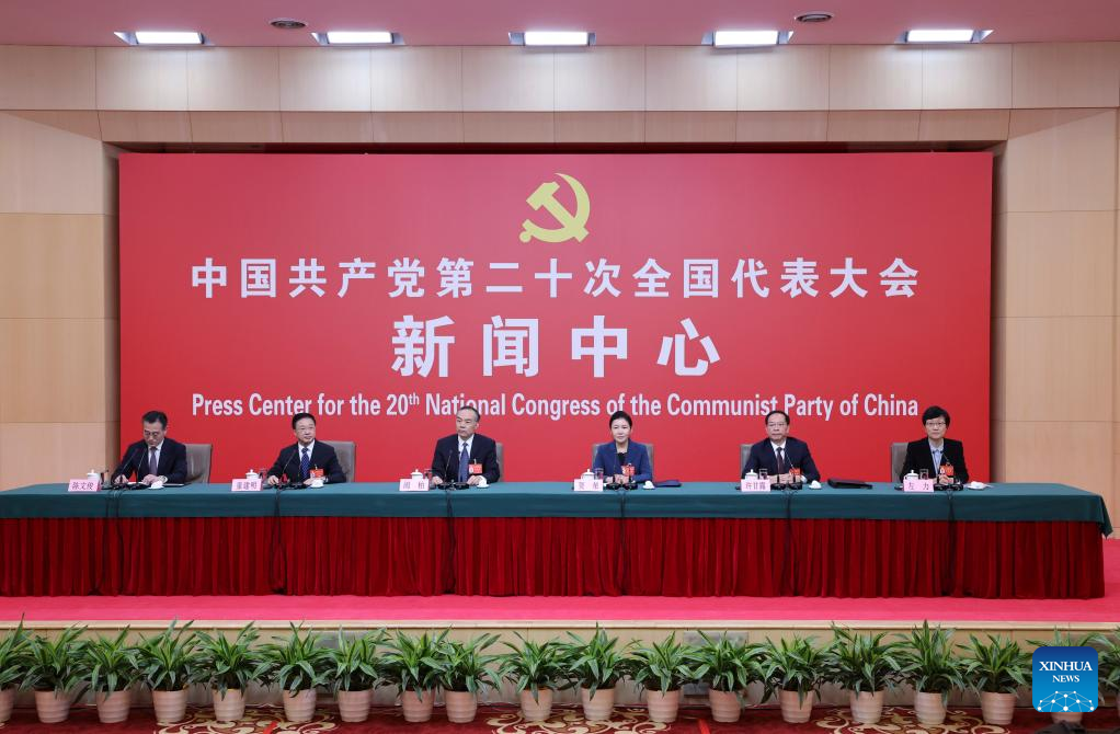 The press center for the 20th National Congress of the Communist Party of China (CPC) hosts a press conference on the topic "Under the Guidance of Xi Jinping Thought on the Rule of Law, Strive to Build Higher-Standard Rule of Law in China" in Beijing, capital of China, Oct. 19, 2022. Yin Bai, deputy secretary-general of the Political and Legal Affairs Commission of the CPC Central Committee, He Rong, vice president of the Supreme People's Court, Tong Jianming, deputy procurator-general of the Supreme People's Procuratorate, Xu Ganlu, vice minister of the Ministry of Public Security, and Zuo Li, vice minister of the Ministry of Justice, attended the press conference. (Xinhua/Zhang Yuwei)
