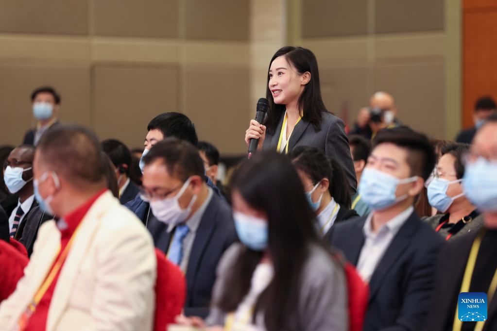A journalist asks questions during a press conference via video link in Beijing, capital of China, Oct. 19, 2022. The press center for the 20th National Congress of the Communist Party of China (CPC) hosted the press conference on the topic "Under the Guidance of Xi Jinping Thought on the Rule of Law, Strive to Build Higher-Standard Rule of Law in China" on Wednesday. (Xinhua/Li Ming)