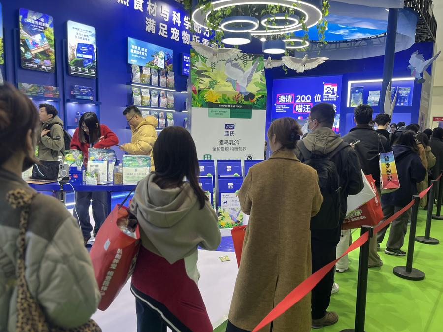 Visitors queue up to claim gift packs at a booth during the Pet Fair Beijing 2025 in Beijing, capital of China, Feb. 27, 2025. (Xinhua/Cao Bin)