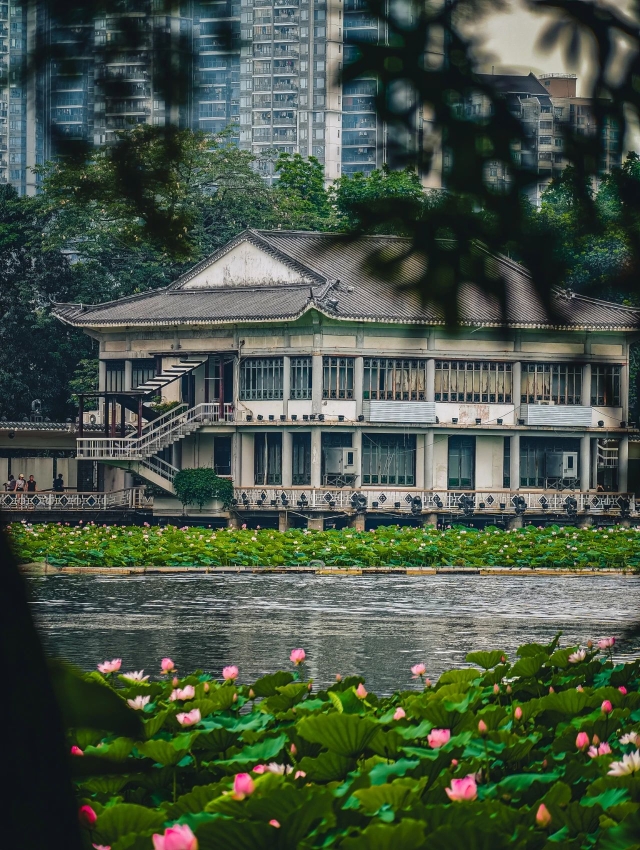 Liwan Lake Park offers a classic Lingnan experience with its blooming lotus flowers set against classical architecture. It's recommended to enter through the north gate and follow the lakeside path to Haishan Xianguan pavilion, the best viewing spot where pink blossoms sway beside carved pavilions and arched stone bridges. The scene is especially enchanting on misty mornings, when fog curls over the water like a classical ink painting.