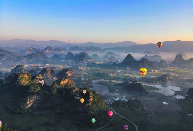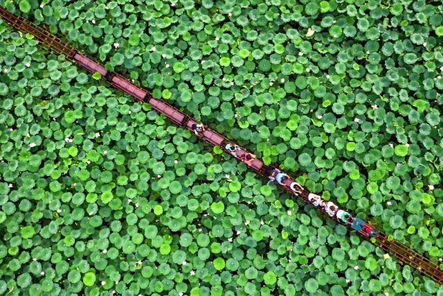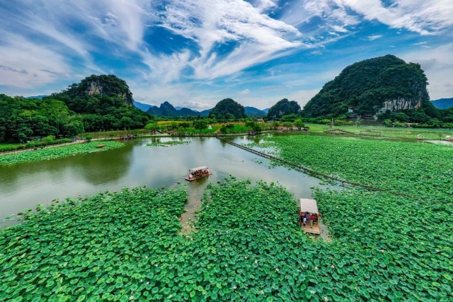 Nestled among karst peaks, Fenglin Xiaozhen Scenic Spot in Yingde features nearly 50 acres of lotus ponds. Mist drifts over emerald waters as pink blooms sway beneath rugged cliffs. Visitors can enjoy bamboo rafting, hop on a scenic train for a close-up view, or take a hot-air balloon ride to admire the lotus sea from above.
