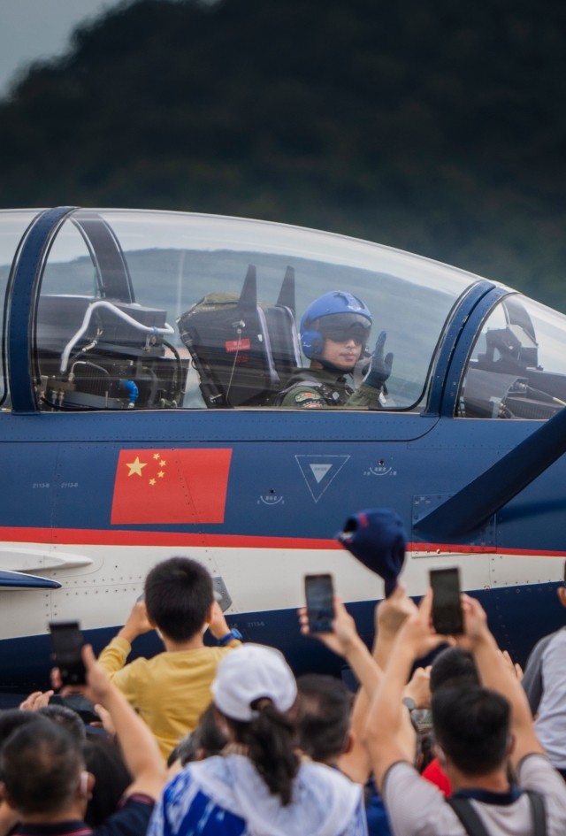 Members of the August 1st Aerobatic Team wave to the audience before departure on the first public day of the 14th Zhuhai Air Show (Photo: Nanfang Daily)