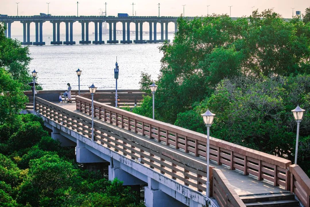 With 32 hectares of wetland and a coastline of 45 kilometers, the park boasts a sea-watching platform that can accommodate over 2,000 visitors, providing superb coastal sightseeing opportunities. Strolling along the greenways, you can witness the breathtaking sight of the sun setting behind the pylons of the Shenzhen-Zhongshan Link.