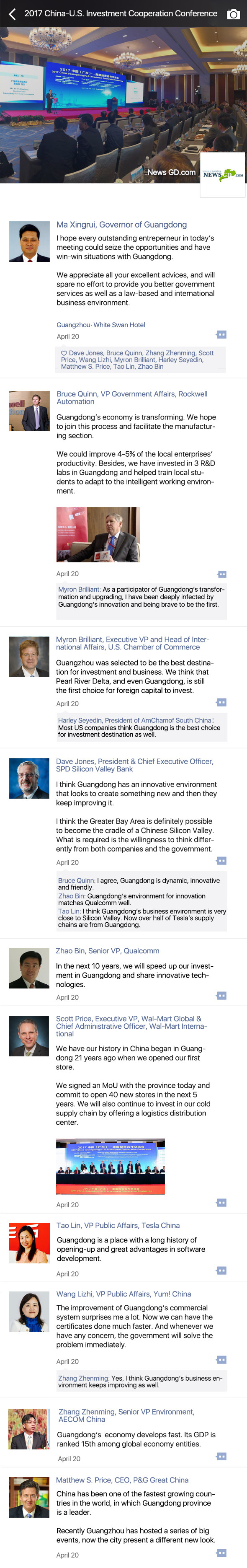 The China (Guangdong)-U.S. Investment Cooperation Forum recently held in Guangzhou on April 20 attracted government officers and leaders of enterprises of both countries.