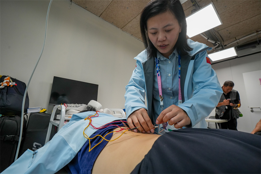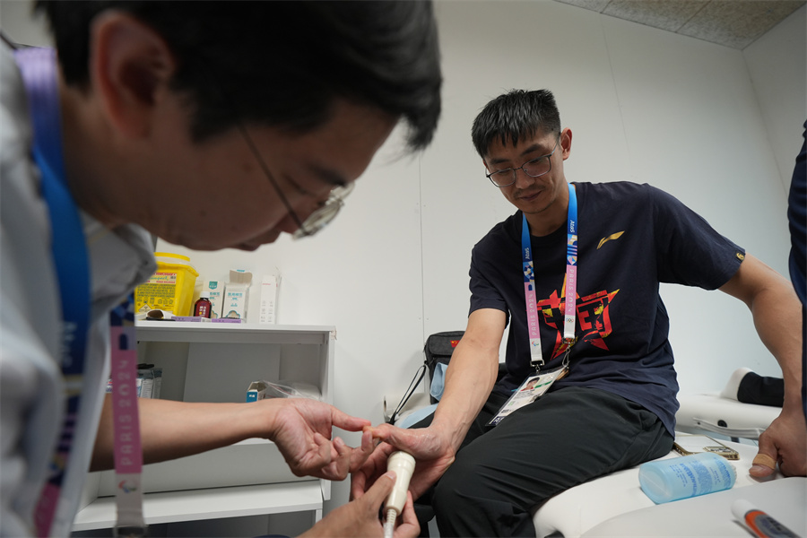 Chinese athletes receive rehabilitation therapy in Paralympic Village in Paris after their pre-competition training on Aug 24. [PENG PENG/FOR CHINA DAILY]