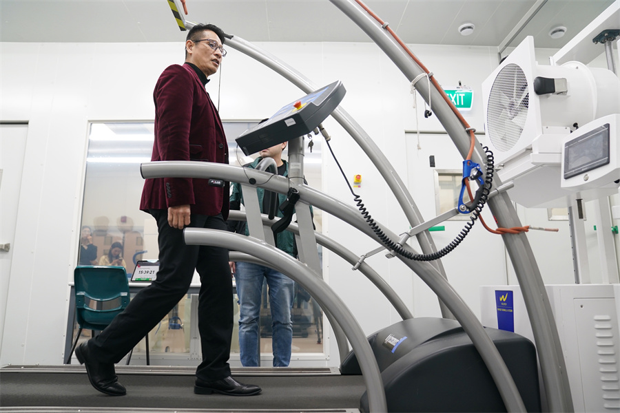 Lau Wing Chung, professor of the Department of Sport and Physical Education at Hong Kong Baptist University, tries research equipment on Jan 21 in Hong Kong. [Photo/Xinhua]