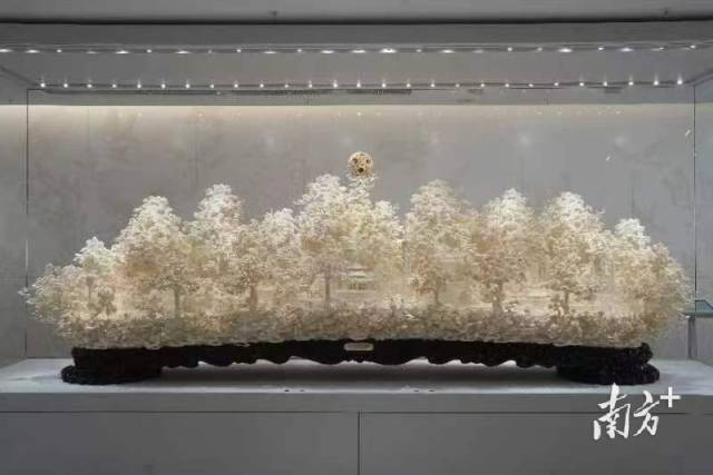 The fourth floor displays a selection of intangible cultural heritage shared by Guangdong, Hong Kong, and Macao, representing the cultural identity of Chinese both at home and overseas. At the entrance stands a five-meter-long bone carving masterpiece. It intricately depicts iconic landmarks of the Guangdong-Hong Kong-Macao Greater Bay Area, such as Guangzhou's Zhenhai Tower, Hong Kong's Golden Bauhinia Square, Macao's Ruins of St. Paul's, Shenzhen's Qianhai International Conference Center, and Zhuhai's Grand Theater. At the peak of the carving is a ball composed of 31 layers.