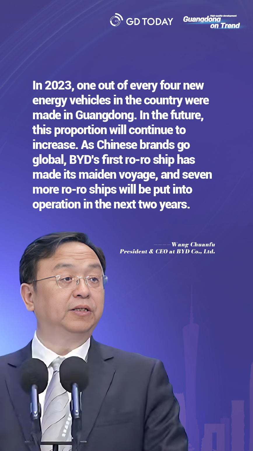 “In 2023, one out of every four new energy vehicles in the country were made in Guangdong. In the future, this proportion will continue to increase. As Chinese brands go global, BYD's first ro-ro ship has made its maiden voyage, and seven more ro-ro ships will be put into operation in the next two years,” said Wang Wang Chuanfu, President & CEO at BYD Co., Ltd.