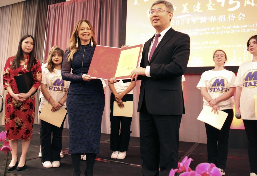 Chinese Consul General in Chicago Zhao Jian (R front) hands Jennifer Fridley, principal of Susan Clark Junior High of Muscatine Community School District, a letter from Chinese President Xi Jinping to the students of Muscatine High School at a reception marking the 45th anniversary of the establishment of China-U.S. diplomatic relations in Chicago, the United States, Feb. 27, 2024. (Xinhua/Xu Jing)