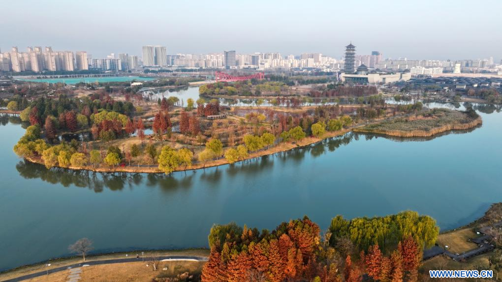 Photo aérienne prise par drone montrant le paysage d'un parc à Yangzhou, dans la province du Jiangsu, dans l'est de la Chine, le 5 décembre 2025. (Photo : Qi Liguang)