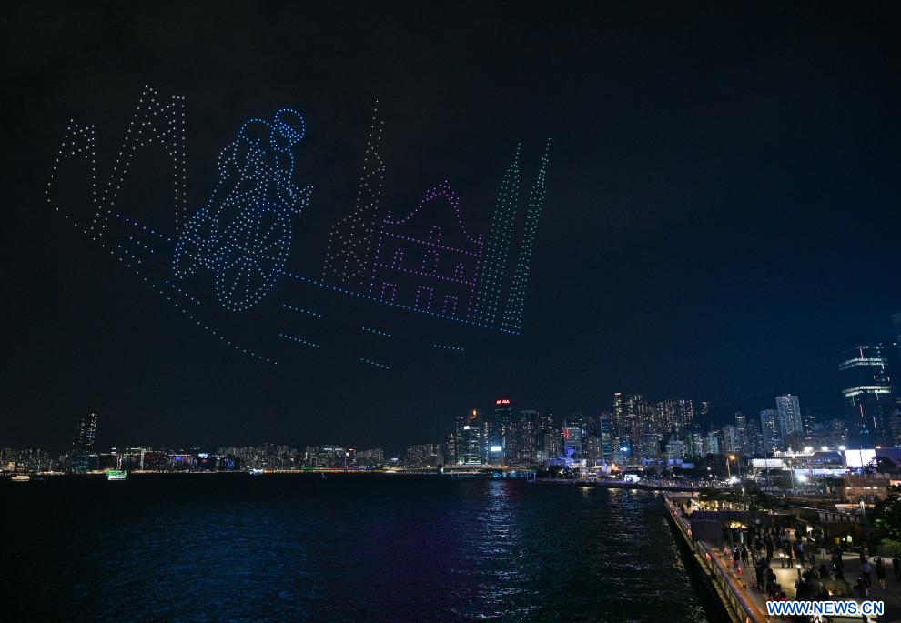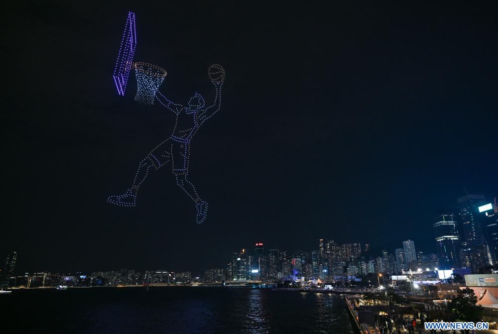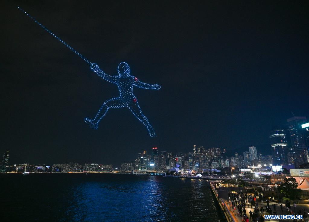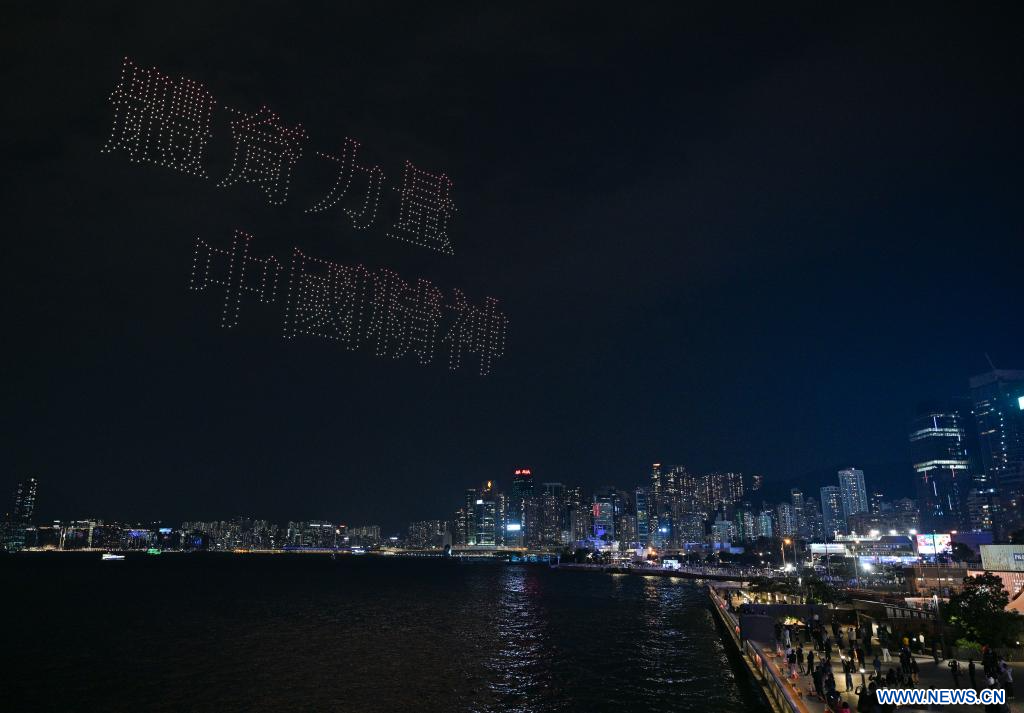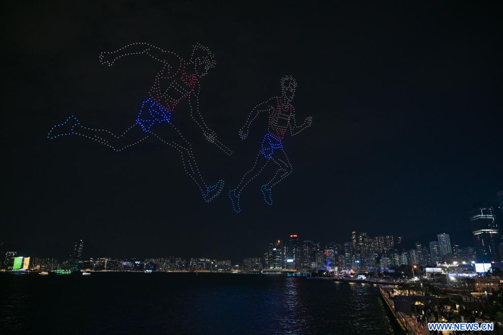 Un spectacle lumineux de drones célébrant l'esprit du sport, à Hong Kong, dans le sud de la Chine, le 18 novembre 2025. (Photo : Chen Duo)
