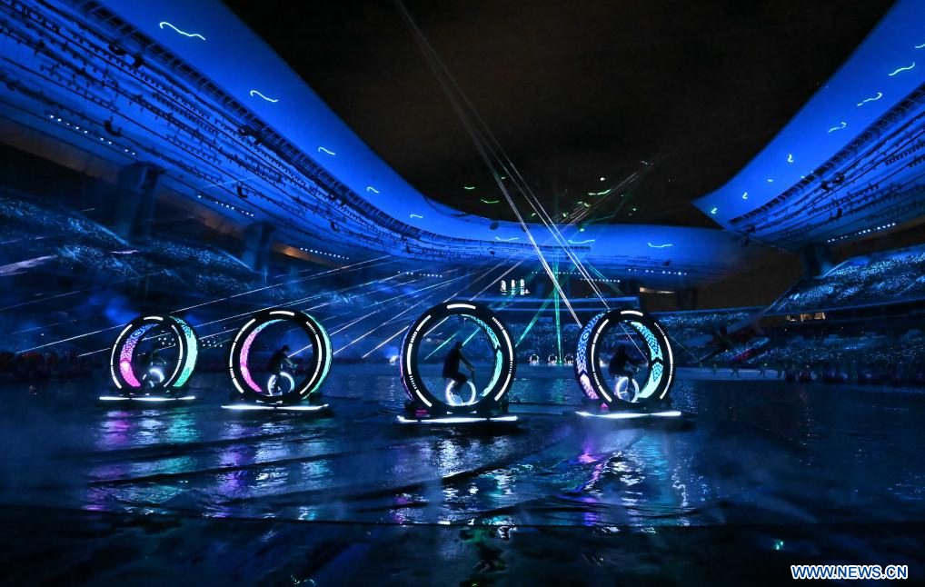 Des artistes participent à la cérémonie d'ouverture des 15es Jeux nationaux chinois, à Guangzhou, dans la province chinoise du Guangdong (sud), le 9 novembre 2025. (Photo : Xiao Yijiu)