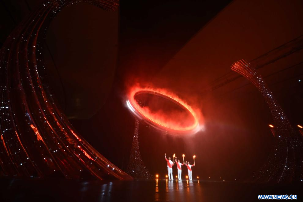 Embrasement de la vasque lors de la cérémonie d'ouverture des 15es Jeux nationaux chinois, à Guangzhou, dans la province chinoise du Guangdong (sud), le 9 novembre 2025. (Photo : Shen Hong)