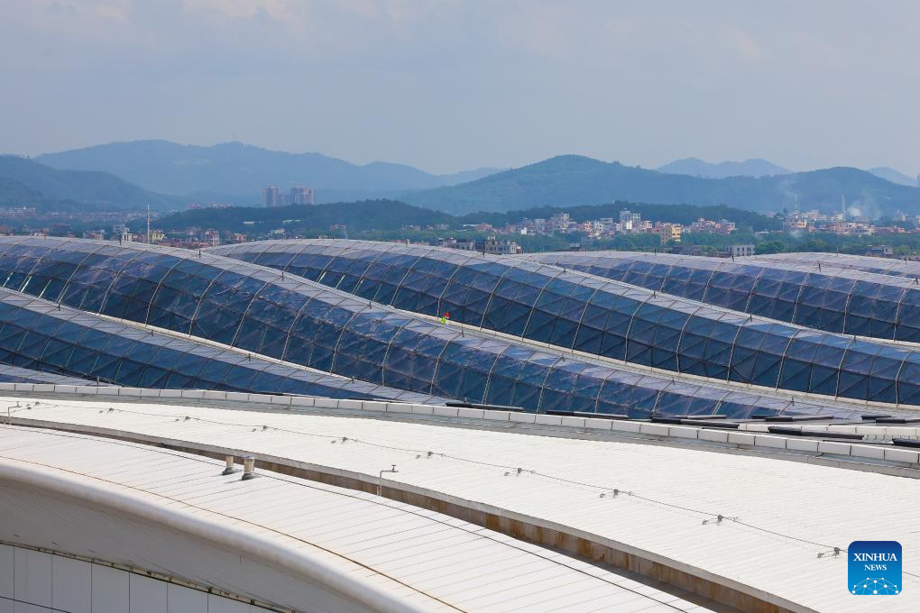 Ce rendu montre le terminal T3 de l'aéroport international Baiyun de Guangzhou, dans la province chinoise du Guangdong (sud). La construction du terminal T3 est maintenant en grande partie achevée, et le terminal devrait être opérationnel d'ici fin 2025. Une fois ce terminal complété et opérationnel, l'aéroport international Baiyun de Guangzhou aura une capacité annuelle de 120 millions de passagers et une capacité de traitement de fret et de courrier de 3,8 millions de tonnes. (Xinhua)