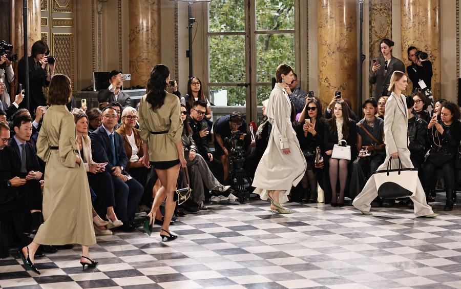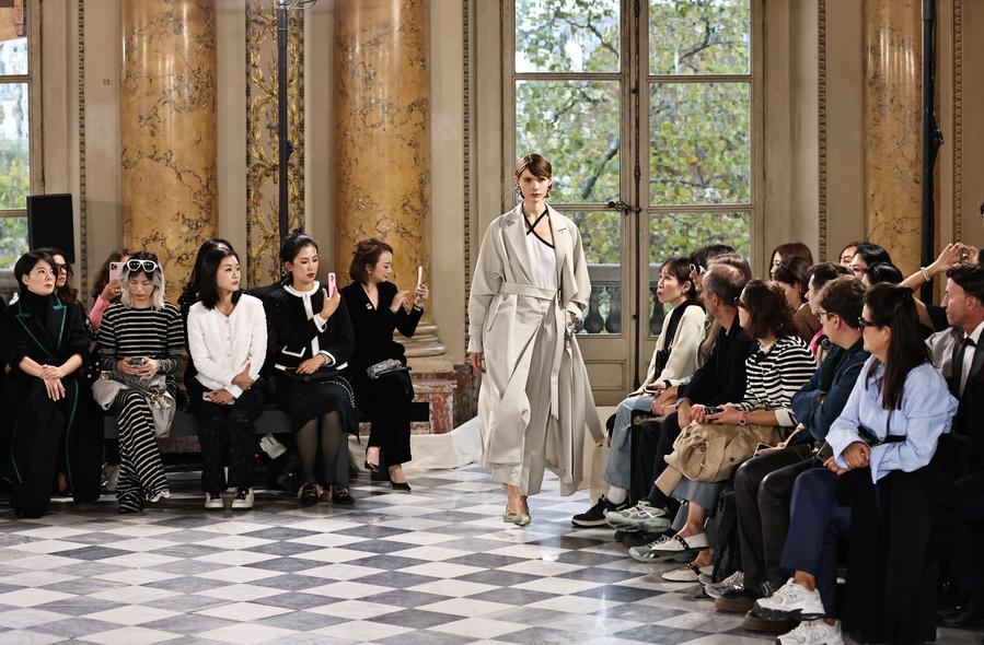 Une mannequin présente une création issue des collections printemps/été 2026 d'YINER lors de l'événement Shenzhen Futian Fashion Day Paris organisé pendant la Fashion Week de Paris, en France, le 29 septembre 2025. (Xinhua/Gao Jing)
