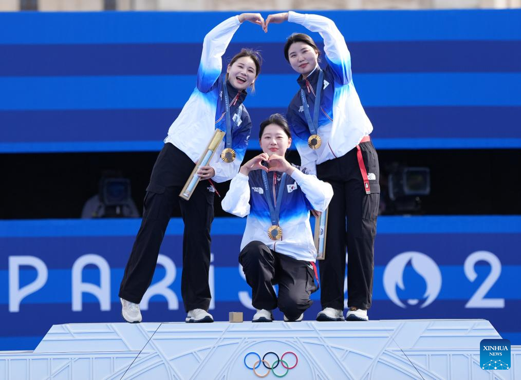Gold medalists Jeon Hunyoung, Lim Sihyeon and Nam Suhyeon (L to R) of team South Korea pose during the awarding ceremony for women's team of archery event at the Paris 2024 Olympic Games in Paris, France, on July 28, 2024. (Xinhua/He Canling)