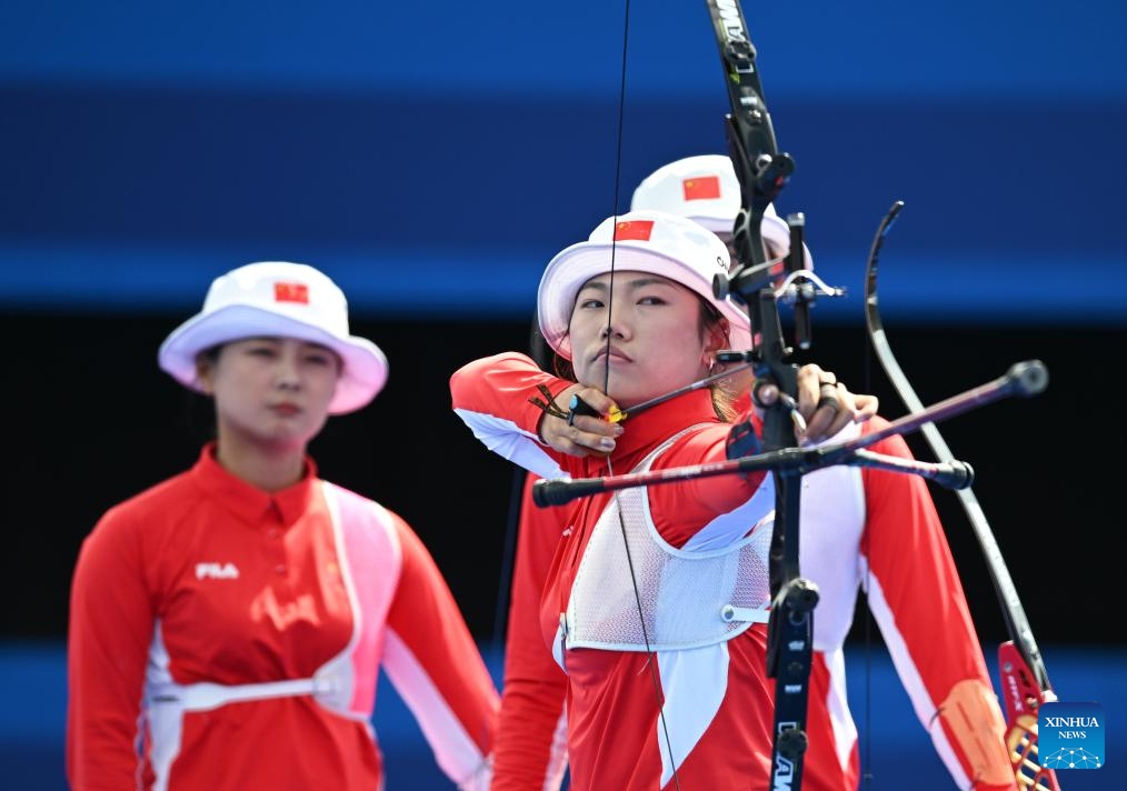 Li Jiaman of team China competes during the women's team semifinal between China and Mexico of archery event at the Paris 2024 Olympic Games in Paris, France, on July 28, 2024. (Xinhua/He Canling)