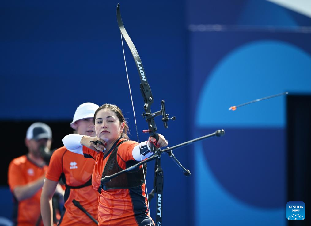 Quinty Roeffen (1st R) of team the Netherlands competes during the women's team bronze medal match between the Netherlands and Mexico of archery event at the Paris 2024 Olympic Games in Paris, France, on July 28, 2024. (Xinhua/Li Ming)