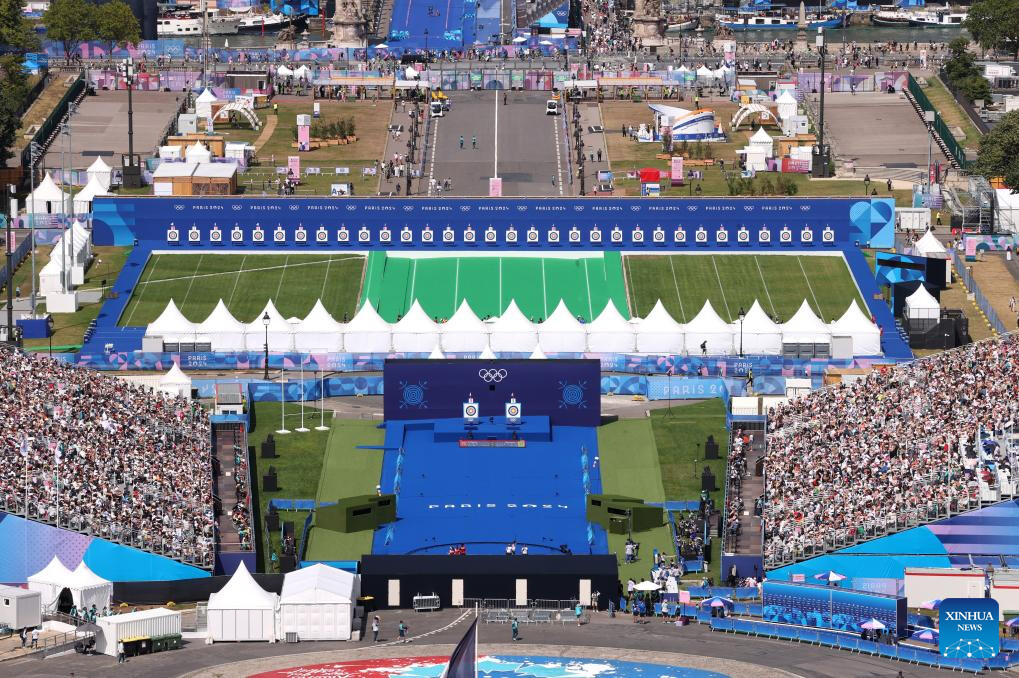 A general view of the Esplanade Des Invalides, the venue of Archery competitions, on day two of the Olympic Games Paris 2024 at the Hôtel des Invalides on July 28, 2024 in Paris, France. (Photo by Alex Pantling/POOL/Xinhua)