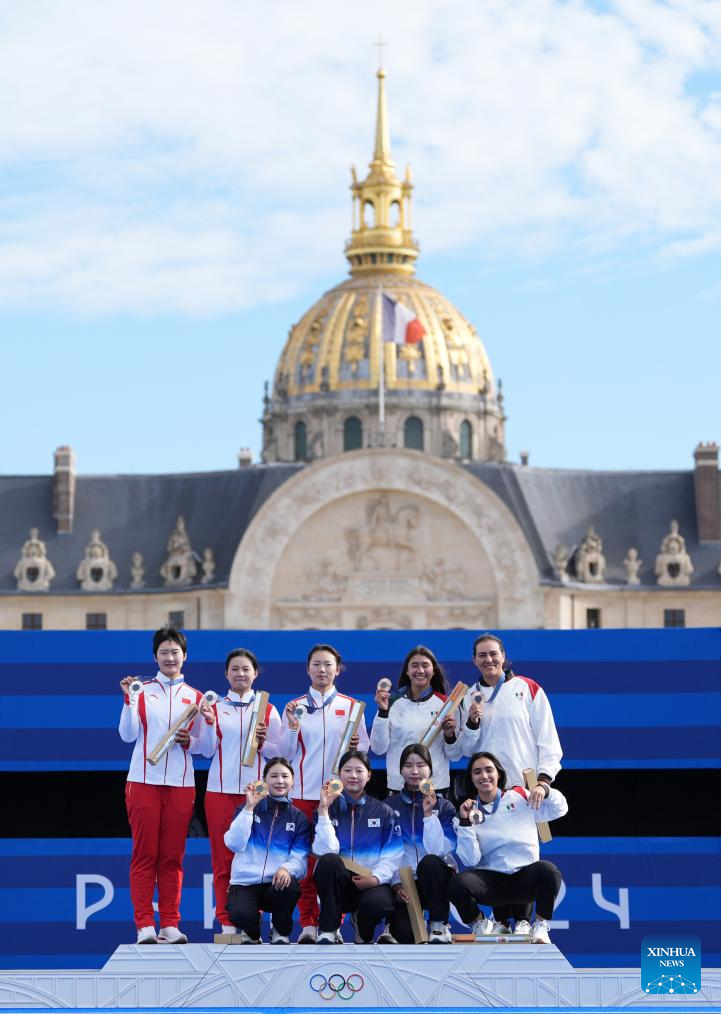 Medalists pose during the awarding ceremony for women's team of archery event at the Paris 2024 Olympic Games in Paris, France, on July 28, 2024. (Xinhua/He Canling)