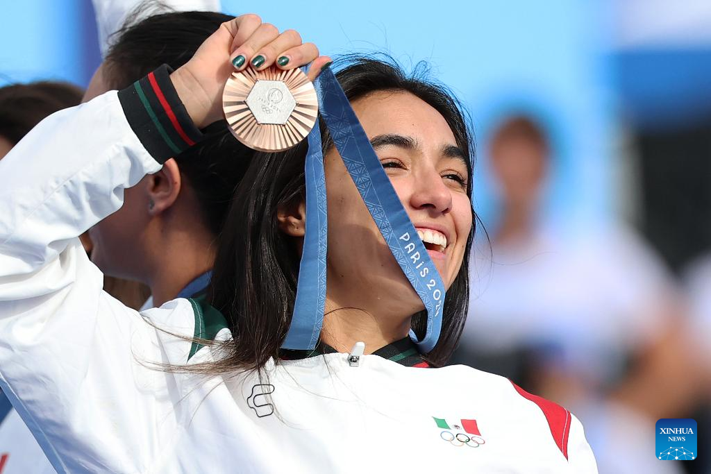 Bronze medalist Ana Vazquez of team Mexico celebrates with the bronze medal during the awarding ceremony of women's team of archery event at the Paris 2024 Olympic Games in Paris, France, on July 28, 2024. (Xinhua/Li Ming)
