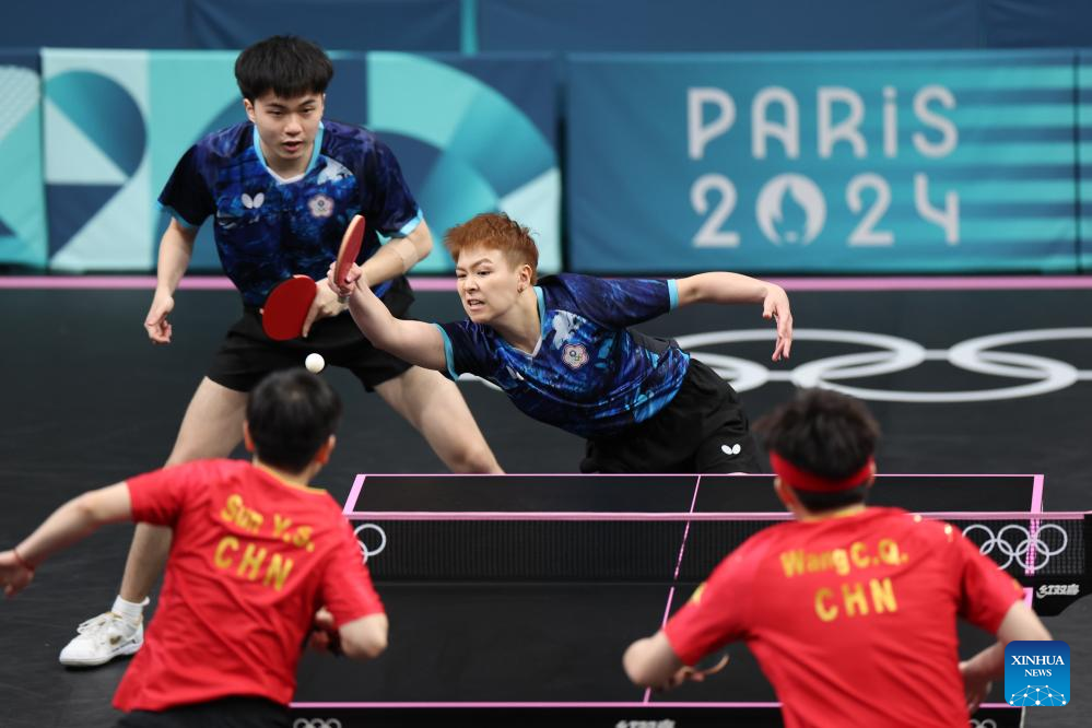 Lin Yun-Ju /Chen Szu-Yu (R) of Chinese Taipei competes during the mixed doubles quarterfinal table tennis match between Wang Chuqin/Sun Yingsha of China and Lin Yun-Ju/Chen Szu-Yu of Chinese Taipei at the Paris 2024 Olympic Games in Paris, France, on July 28, 2024. (Xinhua/Liu Xu)