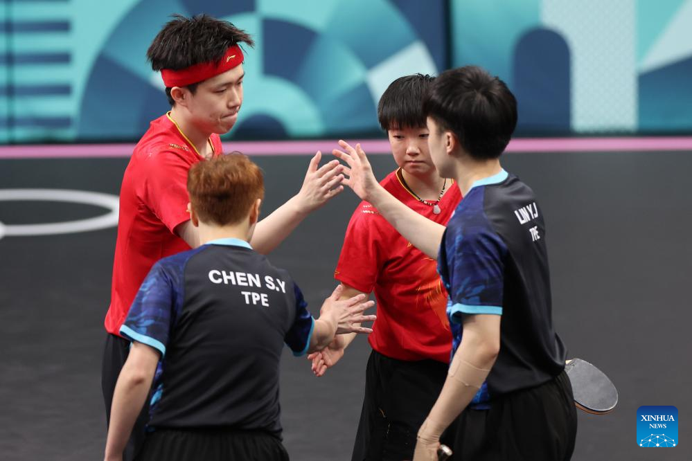 Players greet each other after the mixed doubles quarterfinal table tennis match between Wang Chuqin/Sun Yingsha of China and Lin Yun-Ju/Chen Szu-Yu of Chinese Taipei at the Paris 2024 Olympic Games in Paris, France, on July 28, 2024. (Xinhua/Liu Xu)
