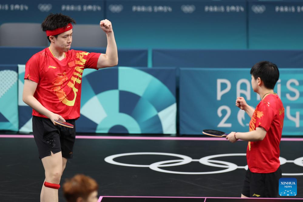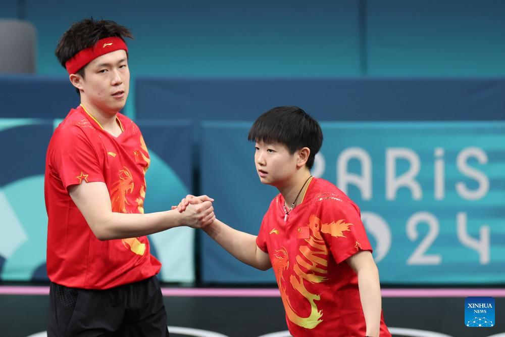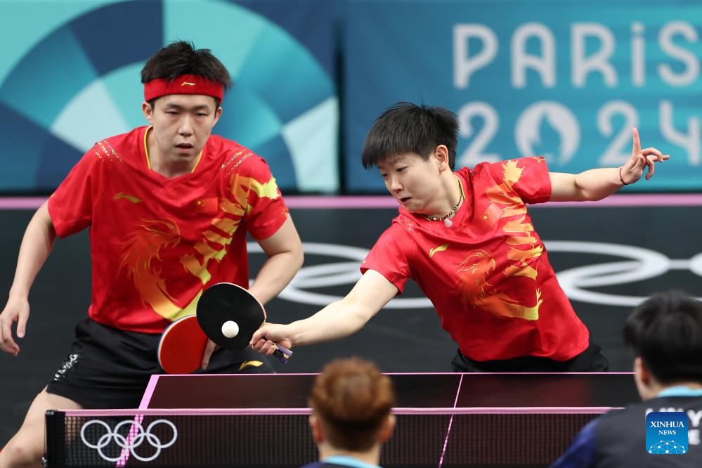 Wang Chuqin/Sun Yingsha (R) of China compete during the mixed doubles quarterfinal table tennis match between Wang Chuqin/Sun Yingsha of China and Lin Yun-Ju/Chen Szu-Yu of Chinese Taipei at the Paris 2024 Olympic Games in Paris, France, on July 28, 2024. (Xinhua/Liu Xu)