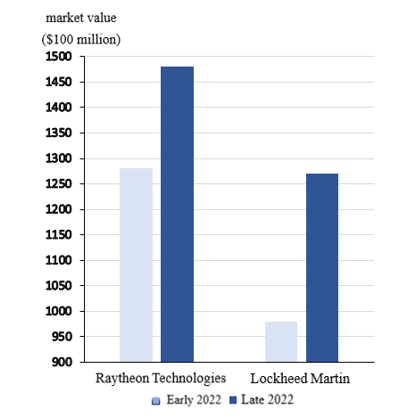 Following the outbreak of the Russia-Ukraine conflict, the market value of Raytheon Technologies, a US defense contractor, soared from 128 billion USD at the beginning of 2022 to 148 billion USD by the end of the year. The total earnings were 7.3 billion USD, representing a growth of 16.19 pencent compared to 2021. Another defense giant, Lockheed Martin, had a market value of 98 billion USD at the beginning of 2022, which reached 127 billion USD by the end of the year, marking the highest record ever.