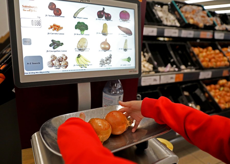 A purchaser weighs food in a supermarket in London, Britain, May 5, 2022. (Photo/Xinhua)