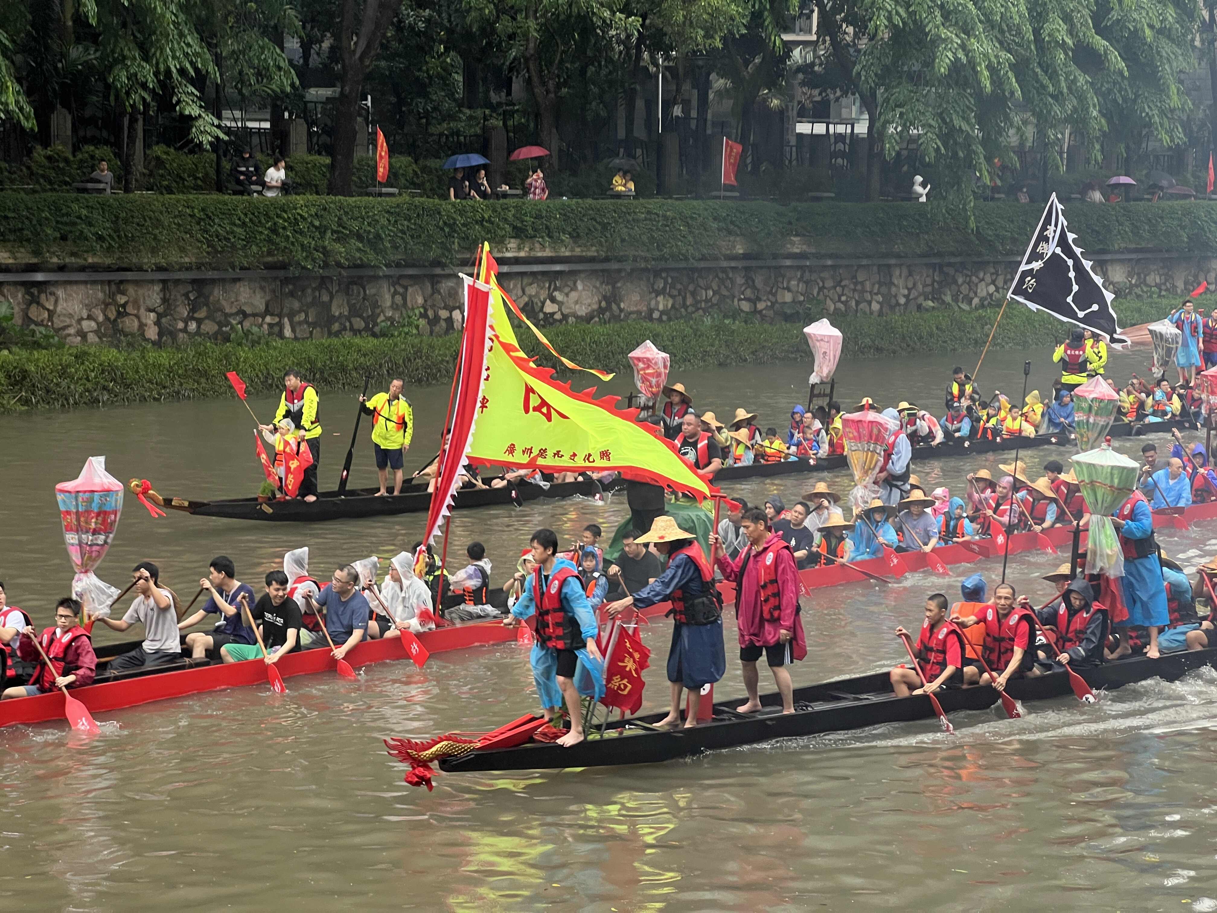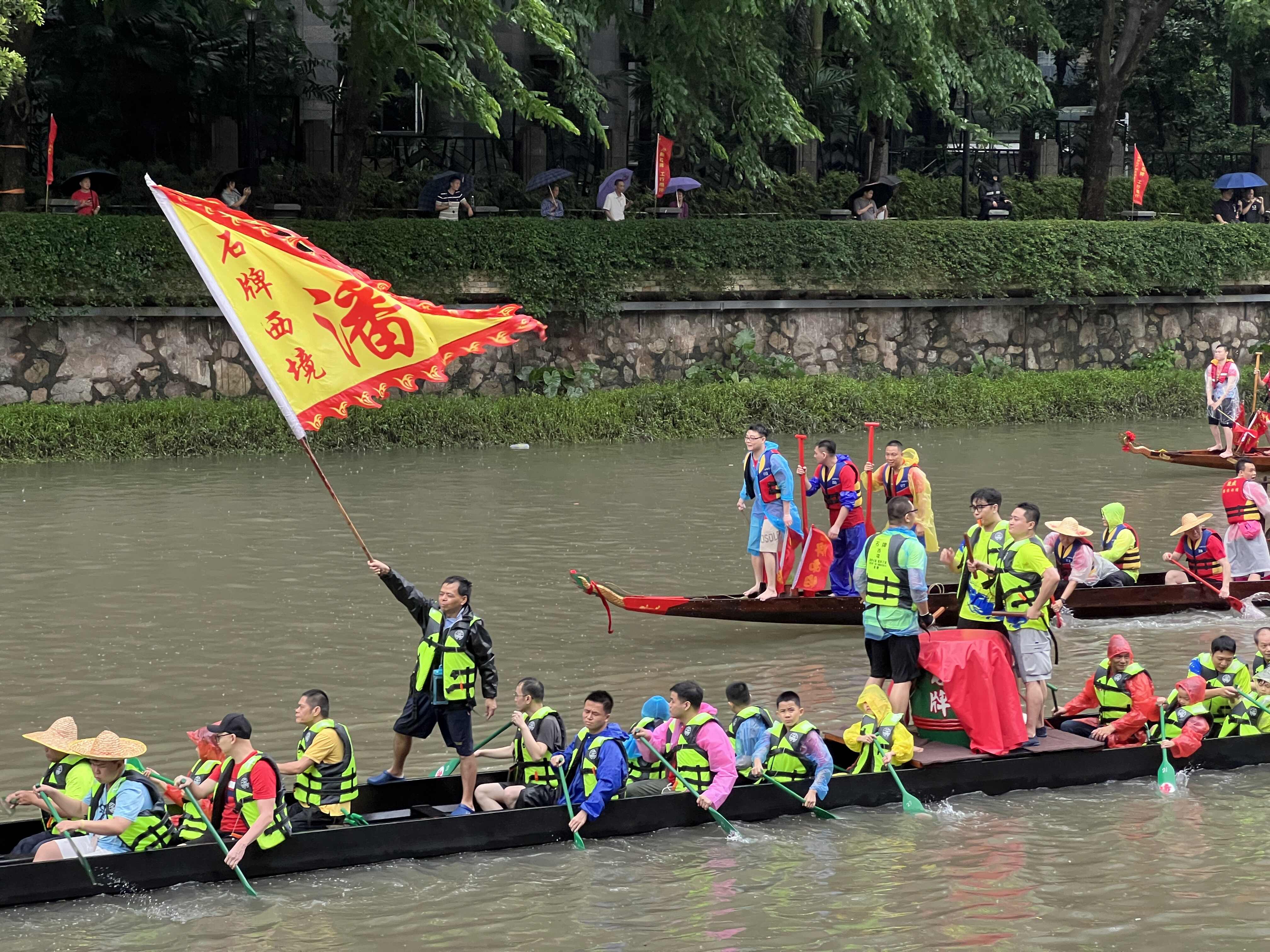 At 2:00 p.m., the ceremony officially commenced. Villagers, carrying dragon heads, dragon tails, bronze gongs, umbrellas, and colorful flags, set off spiritedly towards the Shipai Xinyong River, the Pearl River New Town. Six dragon boats were already docked on the water.