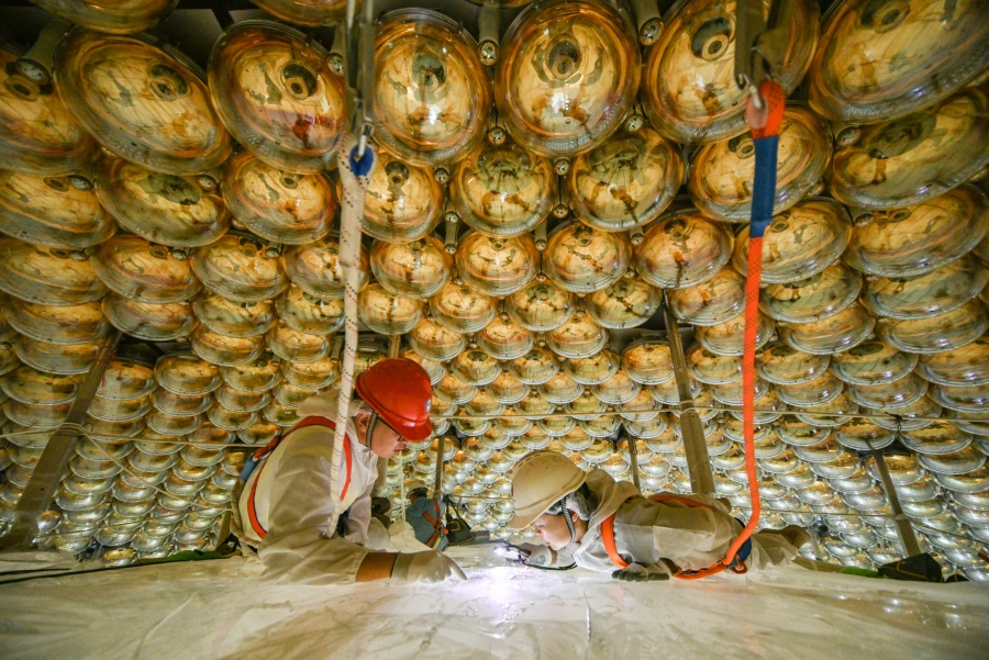 Scientists examine the installation of the structures of the Jiangmen Underground Neutrino Experiment. [Photo provided to chinadaily.com.cn]