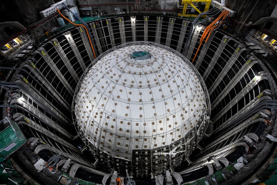 The 35.4-meter acrylic sphere is the crucial component of the core equipment of the Jiangmen Underground Neutrino Observatory — the central detector, surrounded by a stainless steel structure and filled with 20,000 tons of liquid scintillator.