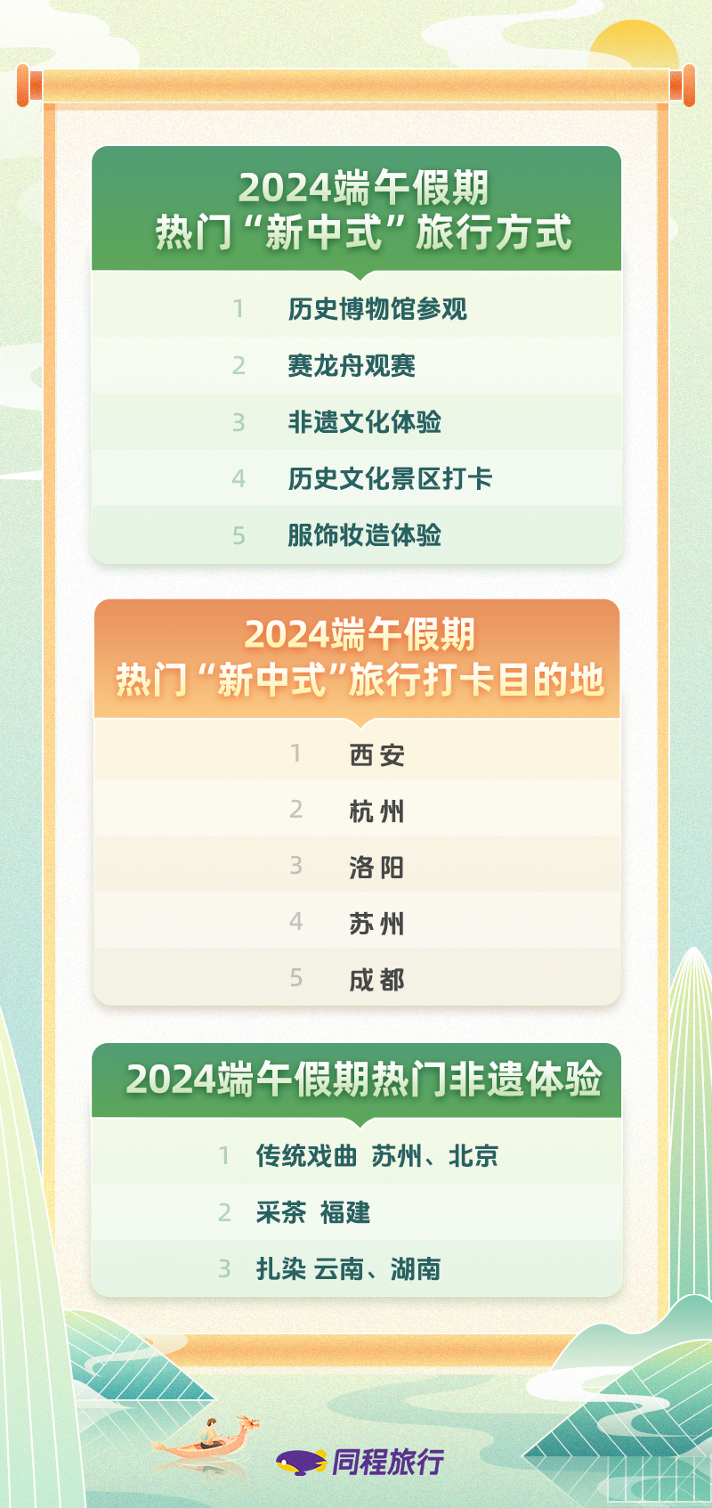 As of now, on the Tongcheng Travel platform, inquiries for two-to-four-hour guided tours and study tours at history museums during the Dragon Boat Festival holiday have more than tripled year-on-year. Xi'an, Hangzhou, Luoyang, Suzhou, and Chengdu are the most popular cities for taking photos in Hanfu. Additionally, traditional opera culture in Suzhou and Beijing, tea-picking culture in Fujian, and intangible cultural heritage tie-dyeing in Hunan and Yunnan are key attractions for Dragon Boat Festival cultural experiences.