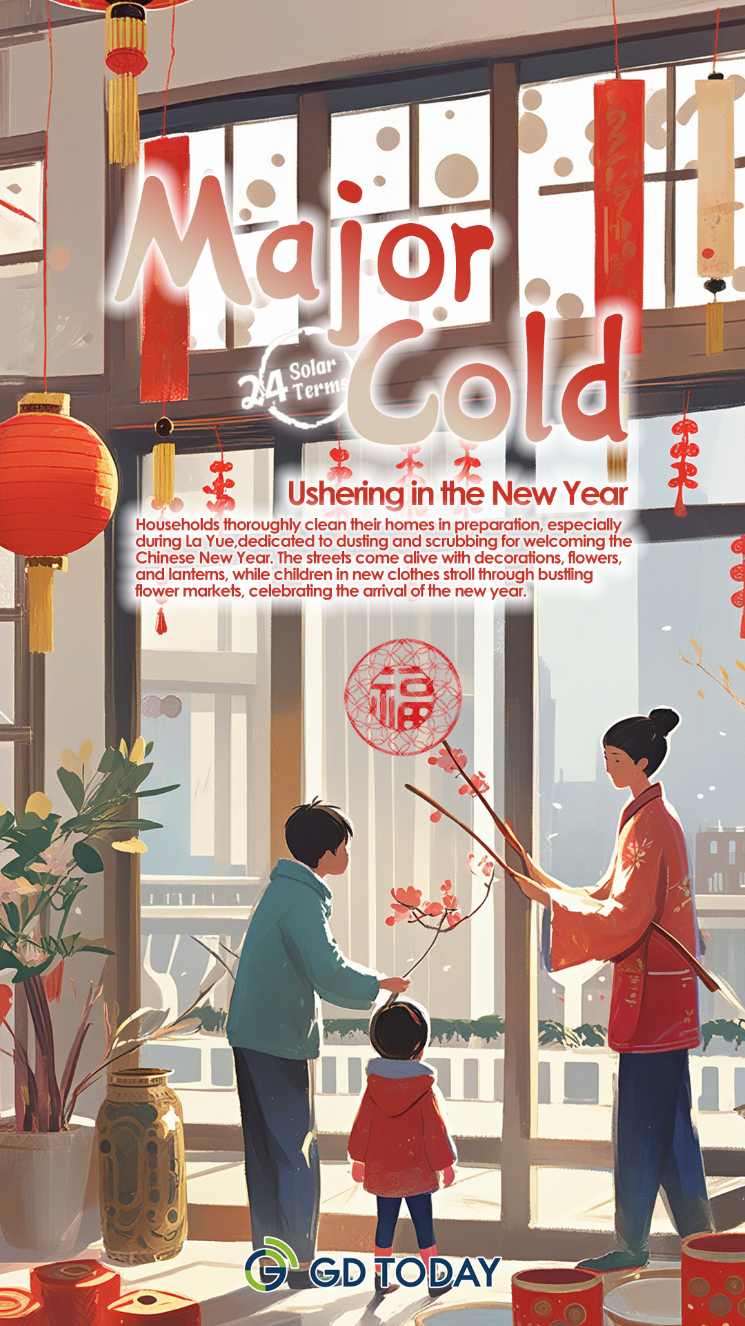 Despite the cold, Major Cold cannot quell the Chinese people's enthusiasm for welcoming the new year and anticipating spring. Households are thoroughly cleaned, ridding their homes of dust and preparing for the new year with a tidy appearance. The 12th lunar month, known as La Yue in Chinese, is inherently associated with dusting and cleaning, with every household bustling with activity—dusting off furniture, scrubbing windows and doors, and discarding trash.