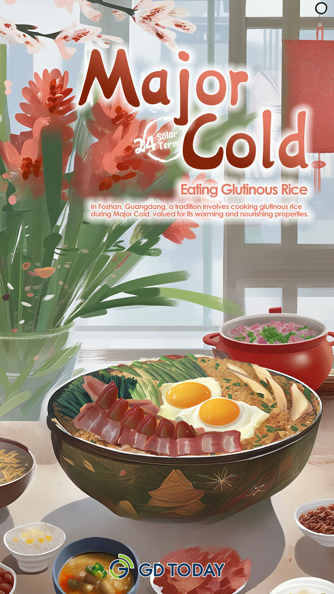As Major Cold converges with the solar term marking the Beginning of Spring, households adjust their diets harmoniously with the seasonal shift. Foods for nourishing the body are gradually reduced to align with the sprouting of all things in spring. In Foshan, Guangdong Province, there is a cherished folk custom of cooking glutinous rice in clay pots during Major Cold. The glutinous rice, sweet in taste and warm in nature, is consumed for its cold-resisting and nourishing properties, providing a comforting warmth during winter's tail.