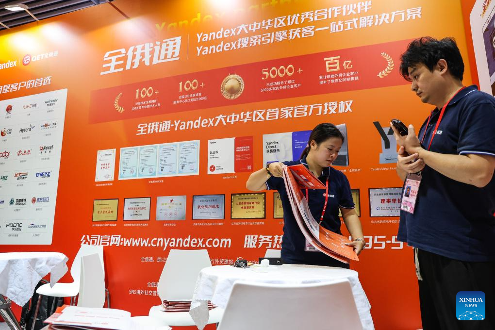 Exhibitors arrange promotion materials at the cross-border e-commerce exhibition area during the 136th China Import and Export Fair in Guangzhou, south China's Guangdong Province, Oct. 15, 2024. (Xinhua/Liu Dawei)