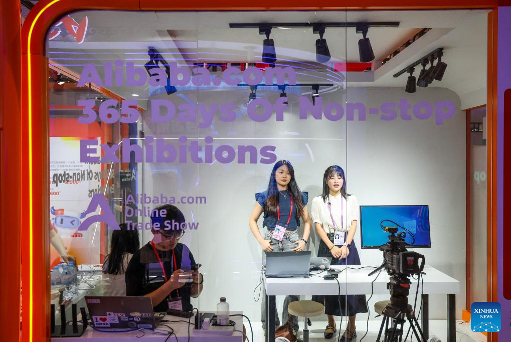 Exhibitors go on a live broadcast at the exhibition area of Alibaba.com during the 136th China Import and Export Fair in Guangzhou, south China's Guangdong Province, Oct. 15, 2024.