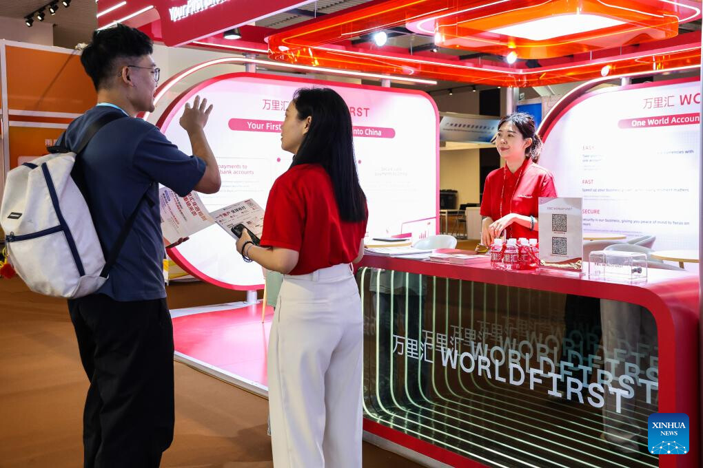 A visitor (L) talks with exhibitors of a company providing supporting service for cross-border e-commerce during the 136th China Import and Export Fair in Guangzhou, south China's Guangdong Province, Oct. 15, 2024. (Xinhua/Liu Dawei)