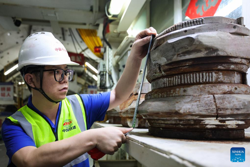 A construction worker from China Railway 14th Bureau Group Co., Ltd. checks the tool abrasion of the "Yongping" shield tunneling machine, in Shantou City, south China's Guangdong Province, on March 26, 2025. The Shantou Bay undersea tunnel, the world's first single-hole double-track undersea tunnel with a designed speed of 350 km per hour, was broken through on Wednesday. The 9,781-meter-long tunnel is a project of the Shantou-Shanwei high-speed railway. (Xinhua/Liu Dawei)