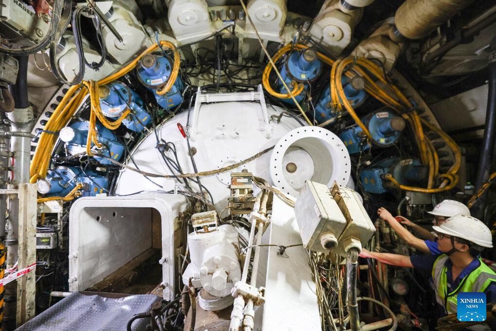 Construction workers of China Railway 14th Bureau Group Co., Ltd. check the "Yongping" shield tunneling machine with an excavation diameter of 14.57 meters, in Shantou City, south China's Guangdong Province, on March 26, 2025. The Shantou Bay undersea tunnel, the world's first single-hole double-track undersea tunnel with a designed speed of 350 km per hour, was broken through on Wednesday. The 9,781-meter-long tunnel is a project of the Shantou-Shanwei high-speed railway. (Xinhua/Liu Dawei)