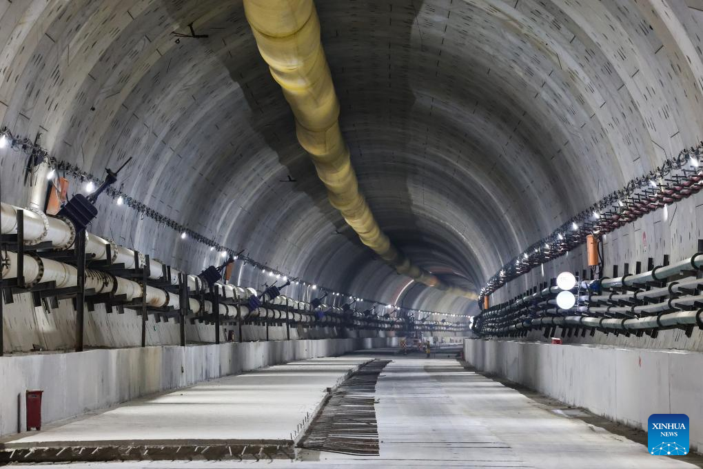 This photo taken on March 26, 2025 shows the Shantou Bay undersea tunnel in Shantou City, south China's Guangdong Province. The Shantou Bay undersea tunnel, the world's first single-hole double-track undersea tunnel with a designed speed of 350 km per hour, was broken through on Wednesday. The 9,781-meter-long tunnel is a project of the Shantou-Shanwei high-speed railway. (Xinhua/Liu Dawei)
