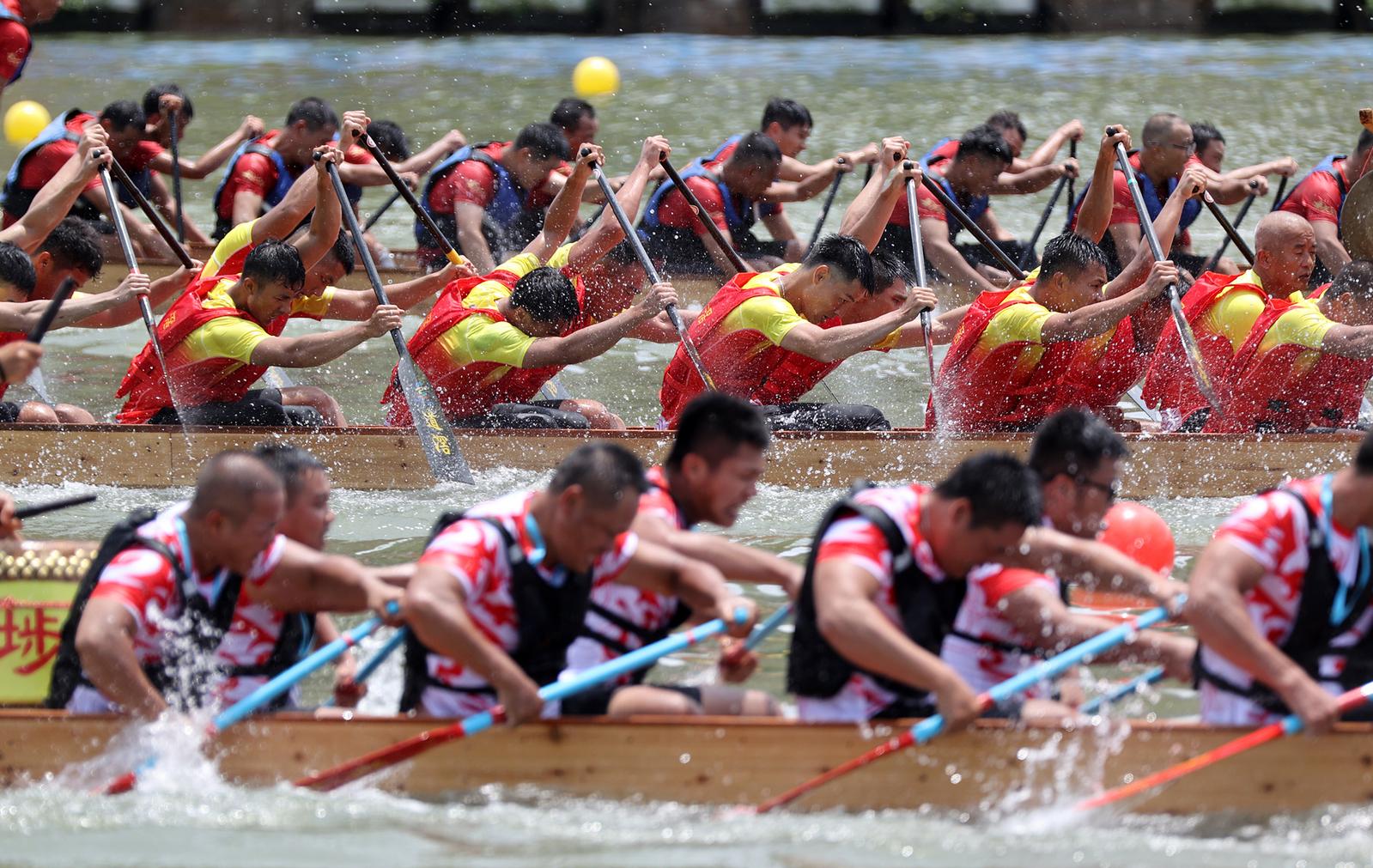 In Dongguan, the dragon boat race is a grand event. Various folk activities and training begin several months before the Dragon Boat Festival, with Dragon Boat Month, lasting over a month, being particularly vibrant. In April, Zhongtang Town and Hongmei Town successively selected a group of agile dragon boat rowers, conducting intensive training to actively prepare for participating in international dragon boat races in Denmark and Switzerland to "win honor for the country". On May 18th, the "hidden dragon" emerged from the waters of Wanjiang Zhengya Village, marking the beginning of Dongguan's Dragon Boat Month.