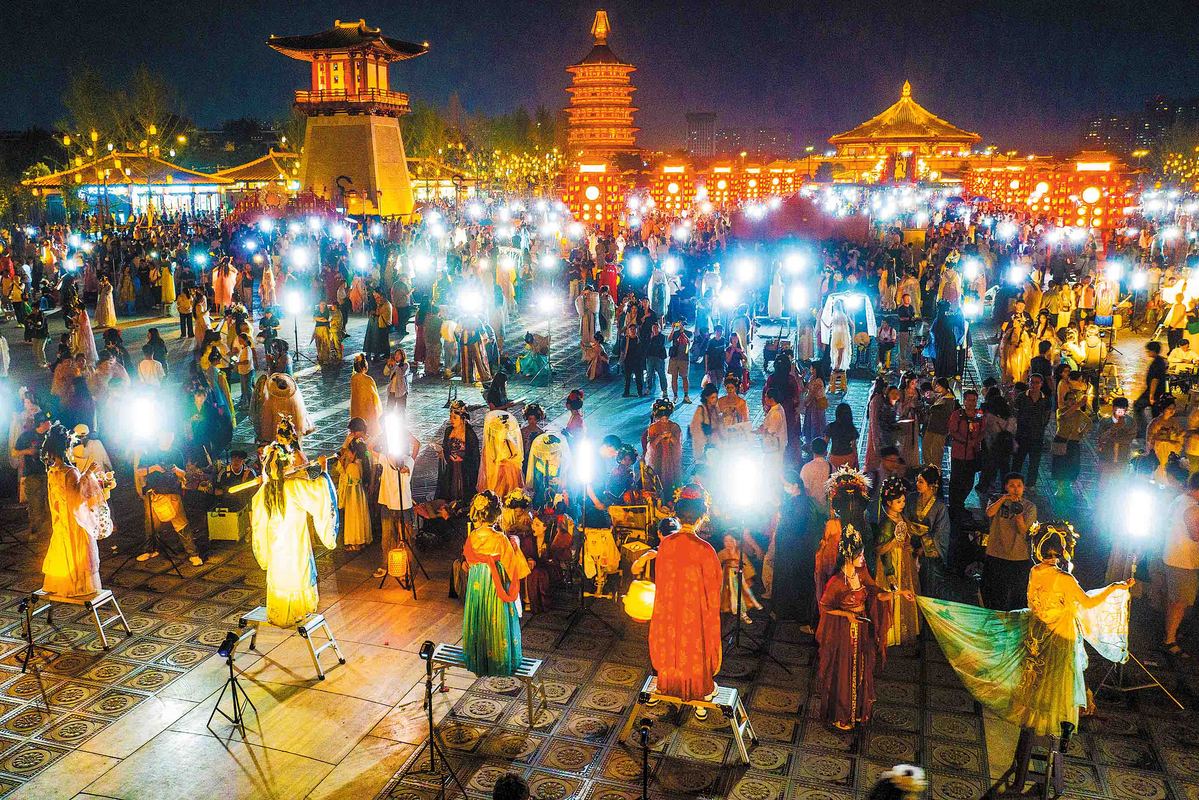 Tourists dressed in traditional hanfu costumes pose for photos in Luoyang, Henan province, on Sunday, the second day of the three-day Dragon Boat Festival holiday. ZHANG YIXI/FOR CHINA DAILY