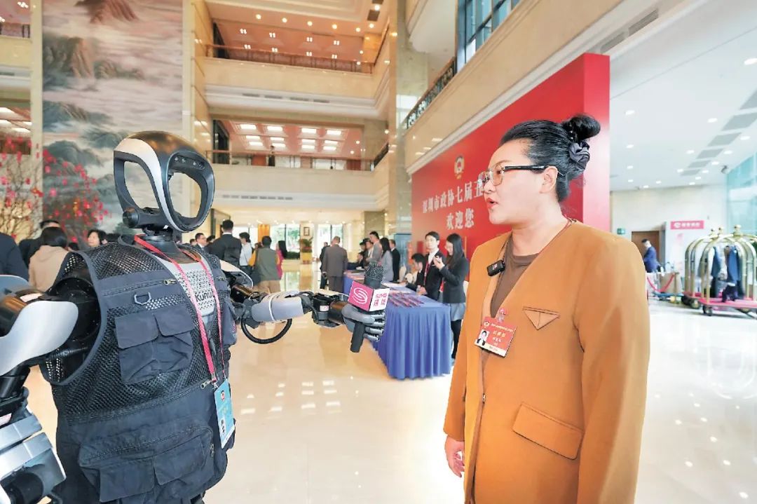 Acting as a journalist, Kuavo — a humanoid robot developed by Shenzhen-based Leju Robot — interviews a political advisor yesterday. Yan Wenting