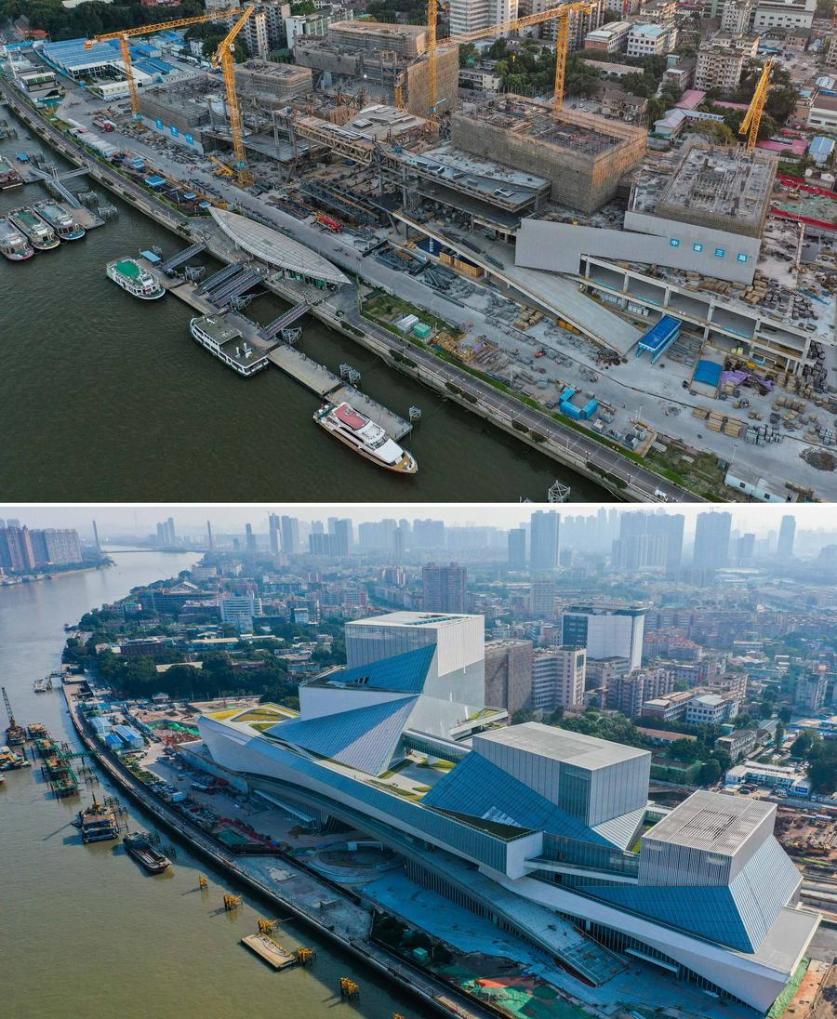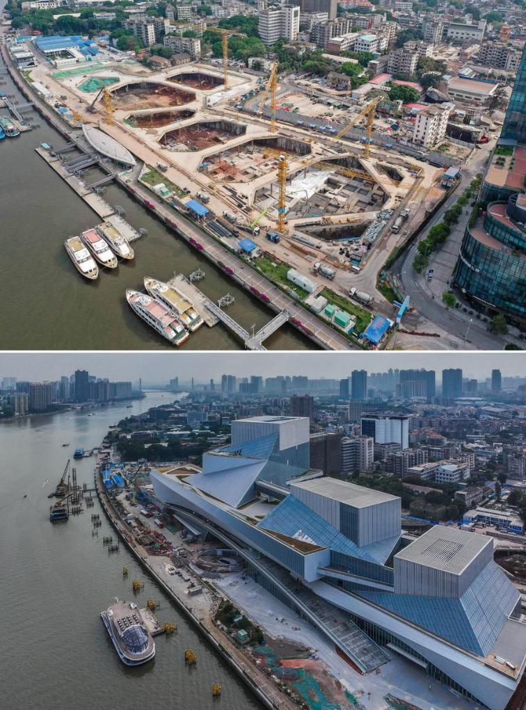 This combo photo shows the Bai'etan Greater Bay Area Art Center under construction in Guangzhou, south China's Guangdong Province, on March 26, 2021 (above) and on Dec. 27, 2023 (photo taken by Xinhua photographer Liu Dawei) respectively. (Xinhua)
