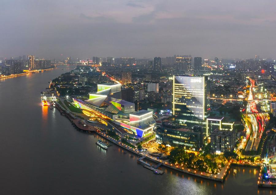 An aerial drone photo shows the Bai'etan Greater Bay Area Art Center (R) in Guangzhou, south China's Guangdong Province, April 27, 2024. (Xinhua/Liu Dawei)