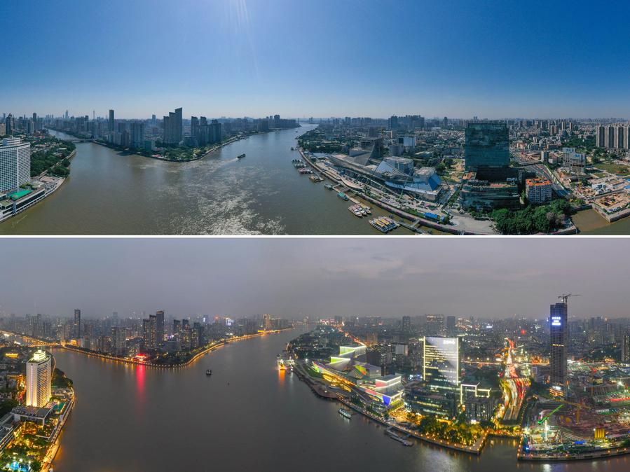 This combo photo shows the Bai'etan Greater Bay Area Art Center under construction in Guangzhou, south China's Guangdong Province, on Dec. 1, 2021 (above) and on Nov. 25, 2023 (photo taken by Xinhua photographer Liu Dawei) respectively. (Xinhua)