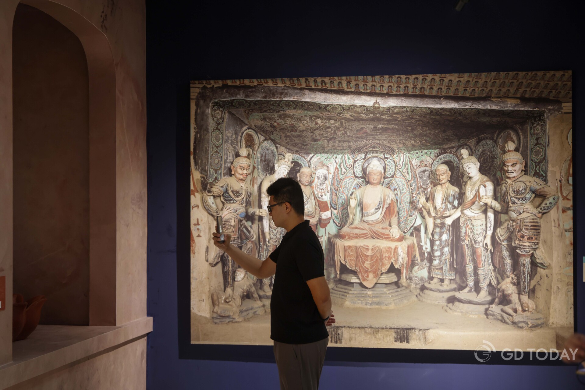 Showcasing over 40 high-fidelity digital reproductions of mural paintings, five replicated colored sculptures, and replicas of artifacts excavated from the Sutra Repository, the exhibition offers a multi-faceted exploration of Dunhuang's artistry. Among the highlights are the Western Wei Dynasty's Cave 285, hailed as a "pantheon of multicultural fusion," and the Yuan Dynasty's Cave 3, renowned for its meticulous depiction of the Thousand-Armed and Thousand-Eyed Guanyin Bodhisattva. These caves, typically closed to the public in Dunhuang, can now be shown in Shenzhen.